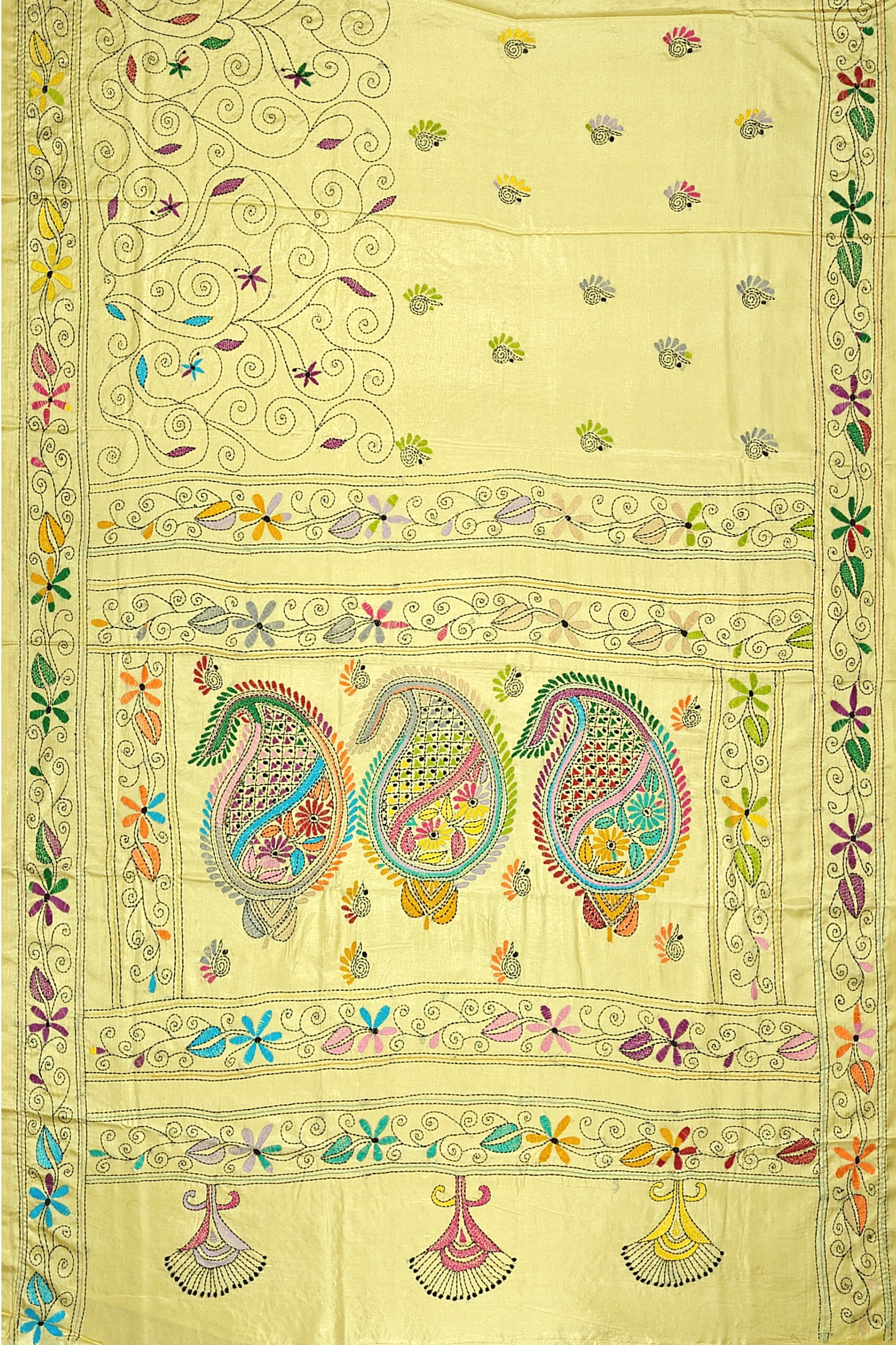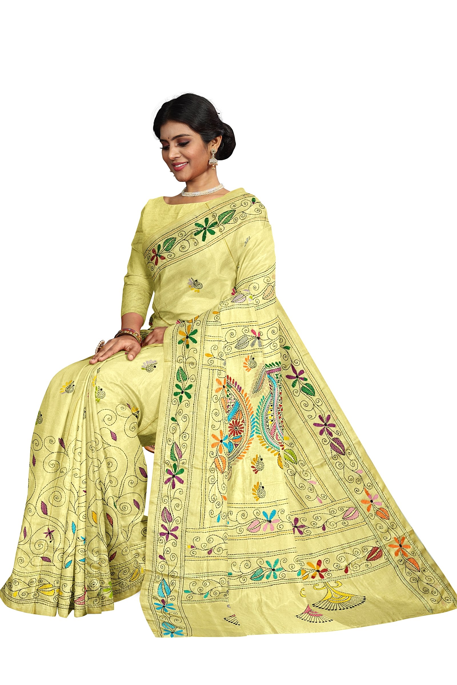 Keywords: Kantha Stitch Silk Saree, Handcrafted Silk Saree, Kantha Saree, Indian Silk Saree, Bridal Silk Saree, Kantha Stitch Saree, Traditional Saree, Bengali Handloom Saree, Luxury Saree in India, Silk Saree for Wedding.