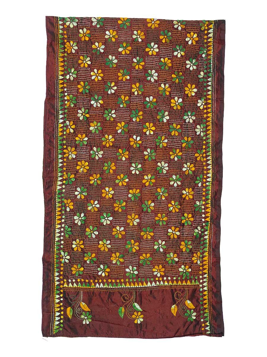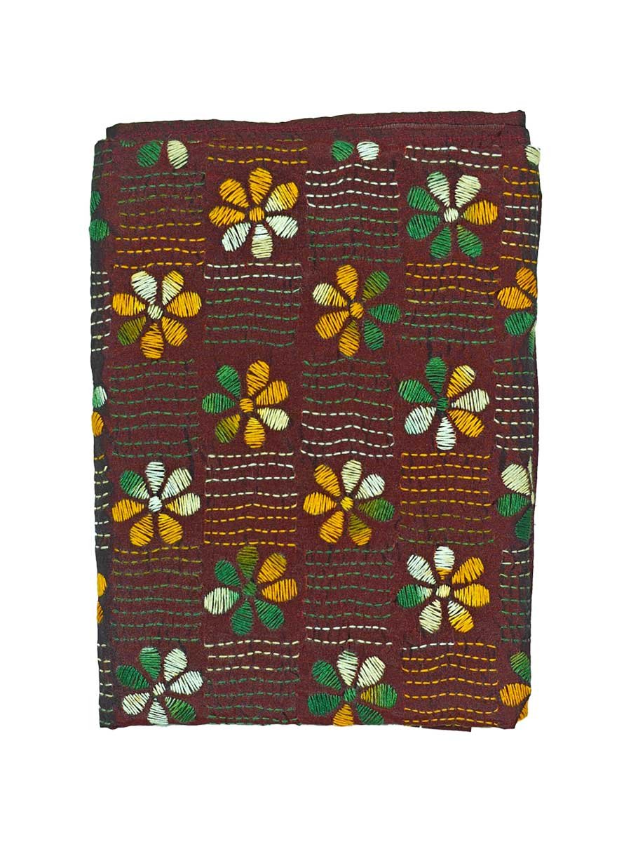 Soul of Bengal brings exclusive Santiniketan Kantha Stitched Silk Stole that mesmerizes everyone with it’s exquisite and elegant look. Kantha stitch is Geographical Indication (GI) product of West Bengal. Kantha work involves complex artistic handwork done by the artisans with a blend of exquisite embroidery in ornamental running stitches. This ethnic Stole has been made in two step process, at first tied and dyed and thereafter hand embroidered with running Kantha stitches. This Stole adds decorative element to any outfit whether western or traditional. When draped around the shoulders it will accentuate your style in a more stunning way. This Kantha embroidery with multicoloured threads enhances your style quotient.