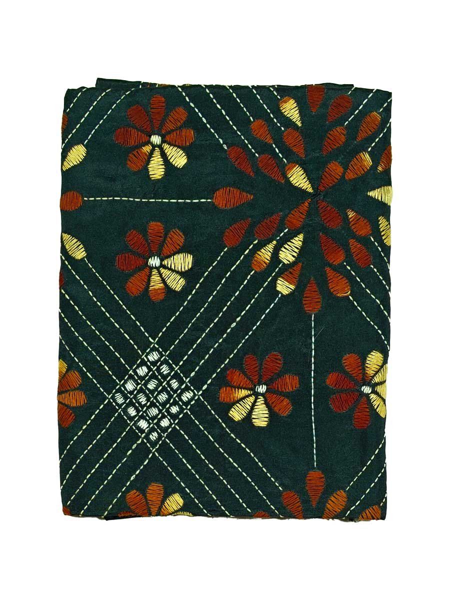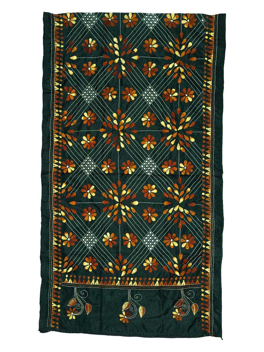 Soul of Bengal brings an exclusive Santiniketan Kantha Stitched Silk Stole that mesmerizes everyone with its exquisite and elegant look. Kantha stitch is a Geographical Indication (GI) product of West Bengal. Kantha work involves complex artistic handwork done by the artisans with a blend of exquisite embroidery in ornamental running stitches. This ethnic stole has been made in a two-step process, at first tied and dyed and thereafter hand embroidered with running Kantha stitches. This stole adds a decorative element to any outfit, whether western or traditional. When draped around the shoulders, it will accentuate your style in a more stunning way. This Kantha embroidery with multicolored threads enhances your style quotient.